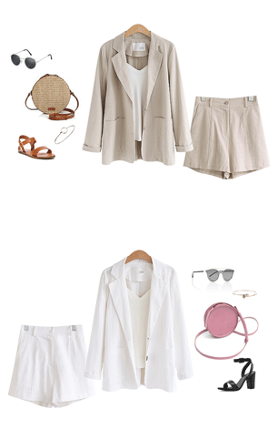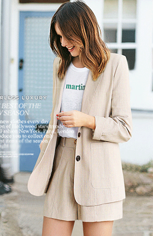 SPEC 商品内容 ジャケット×ショートパンツ 2点セット カラー Ivory(アイボリー), Beige(ベージュ), Pink(ピンク), Navy(ネイビー), Black(ブラック) 素材 コットン 80%, リネン 20% サイズ Free 実寸(cm) ●ジャケット 総丈:67 / 肩幅:38.5 / バスト:101 / 袖丈:58 ●パンツ 総丈:35 / ウエスト(ゴム):78 / ヒップ:80 / 裾幅:69 / 股上:28.5 素材情報 厚さ| □厚い □普通 ■薄い 伸縮性| □あり □若干あり ■なし 透け感| □あり ■多少あり □なし (色によって異なります) 裏地| □あり □一部あり ■なし 関連商品 生産国 韓国 洗濯方法 必ずドライクリーニングまたは軽く手洗いしてください。